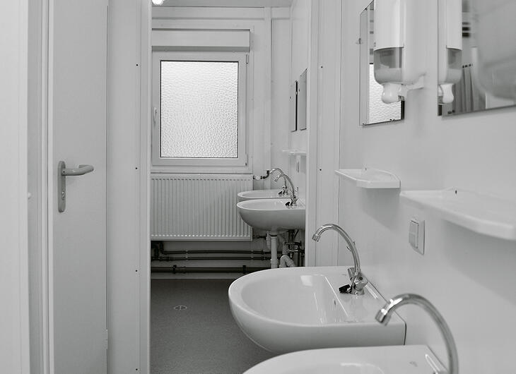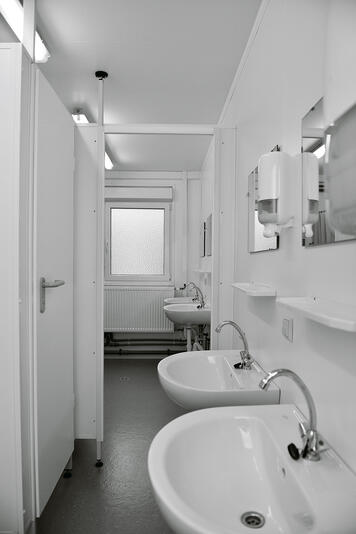 Available to rent or buy, ELA sanitary containers are impressive: Flexibly equipped with WCs, urinals, sinks, mirrors and LED lighting, they can be combined with container systems for any application either individually or as a complete sanitary area. The modern fittings and bright interior design make a good impression and are easy to clean, so teachers and pupils alike will feel at ease in sanitary rooms from ELA.